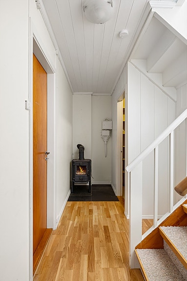 Boligen har vedovn, som gir en alternativ og koselig varmekilde.