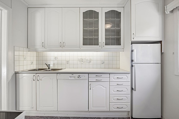 Kjøkkeninnredningen er av eldre dato og har vanlig bruksslitasje. Kjøkkenvifte bør byttes.