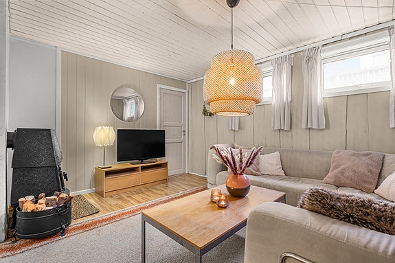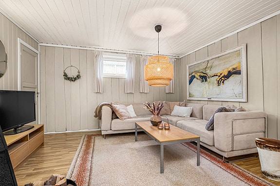 Kjelleren er innredet som en egen leilighet, men dette er ikke godkjent av kommunen. Rommene oppfyller heller ikke krav til for eksempel dagslys. Dette er en ulovlig situasjon som kjøper overtar ansvaret for.
