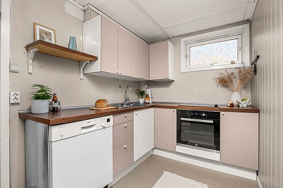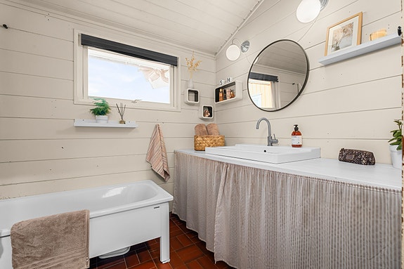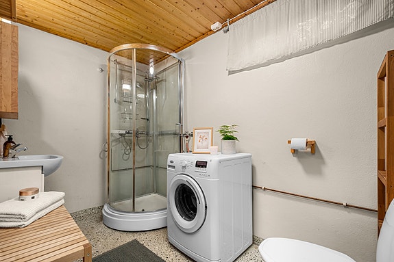 Badet i kjelleren er heller ikke bygget etter dagens regler for våtrom. Det mangler også god lufting. Rommet burde pusses opp for å unngå fuktskader.