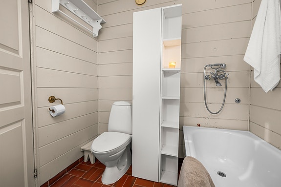 Badet i første etasje er gammelt og tilfredsstiller ikke dagens krav til tette våtrom. Varmekablene virker heller ikke. Hele rommet burde fornyes.
