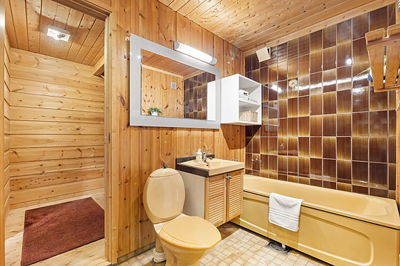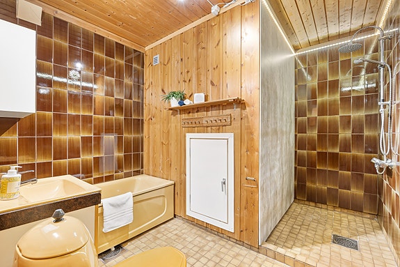 Badet i underetasjen er fra 1979. Rør, sluk og membran er gamle, og det er stor fare for lekkasjer. Hele badet burde pusses opp.