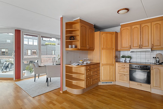 Kjøkkeninnredningen antas å være fra byggeåret (1998) med svelling i sokkelfronter og fuktmerker\/skader på parkettgulvet etter en tidligere vannlekkasje. Avtrekk fungerte dårlig ved befaring, kilde: 10, 26, 29.