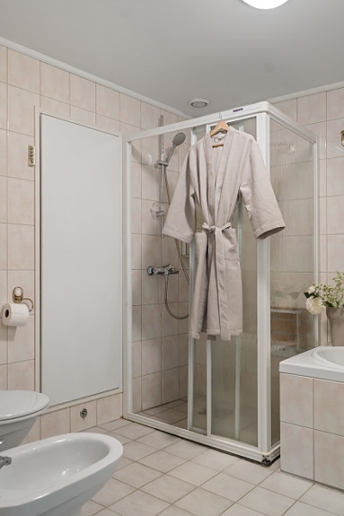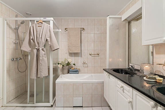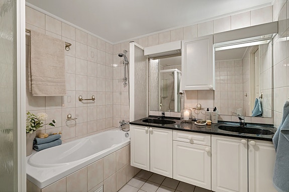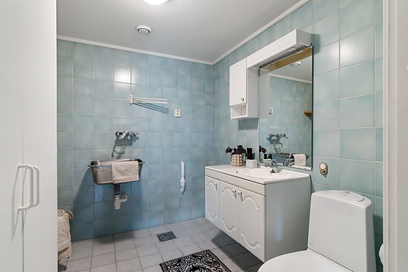 Badet har sprukne fliser i dusjsonen, bomlyd under flisene, svertesopp\/misfarging i flisfuger, og tettesjiktet har nådd en alder som gjør tettheten usikker, kilde: 11, 27, 32.