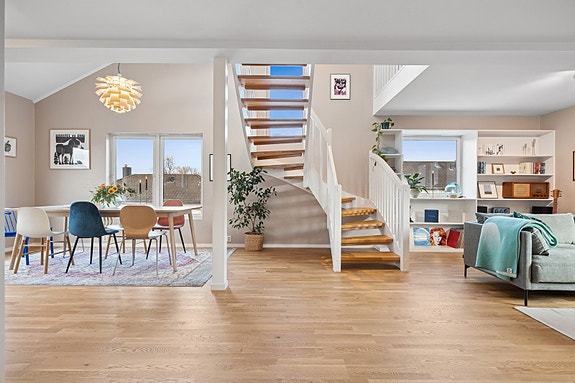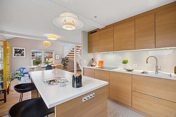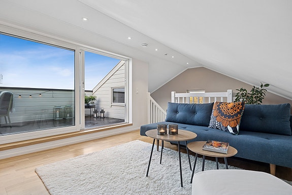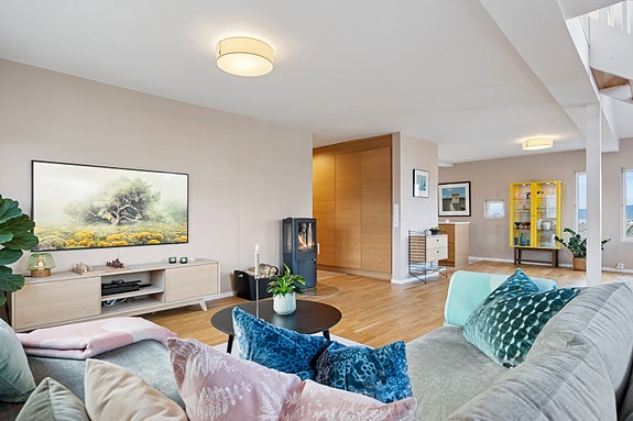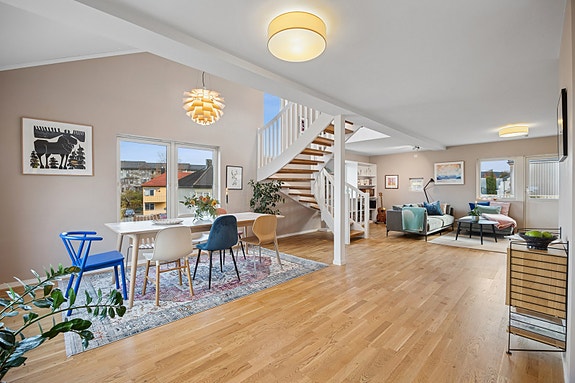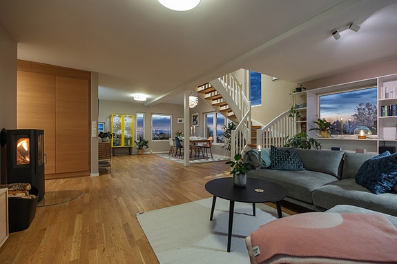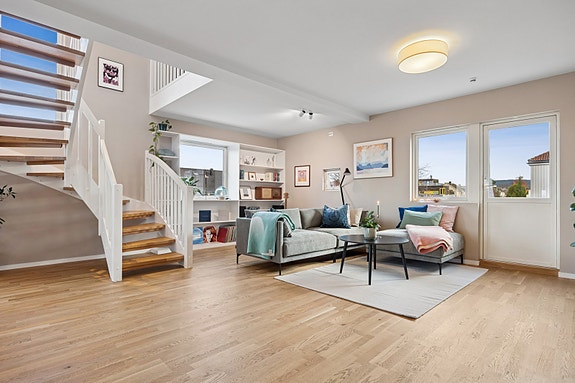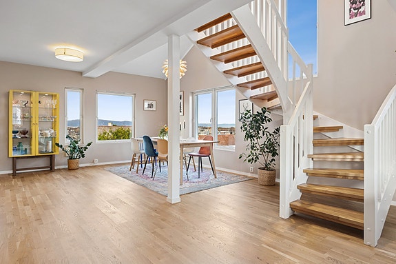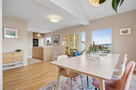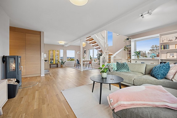 Denne selveierleiligheten over to plan fremstår med moderne standard etter omfattende oppussing i 2022 og innredning av loft i 2014. Den har fantastisk fjordutsikt og to solrike uteplasser, men krever betydelige investeringer i drenering, rør og etasjeskille.