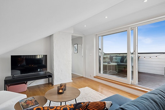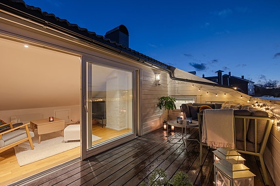 Boligen har en balkong på 16 kvm med morgen- og formiddagssol, og en takterrasse på 11 kvm med ettermiddags- og kveldssol, begge med gode utsiktsforhold.